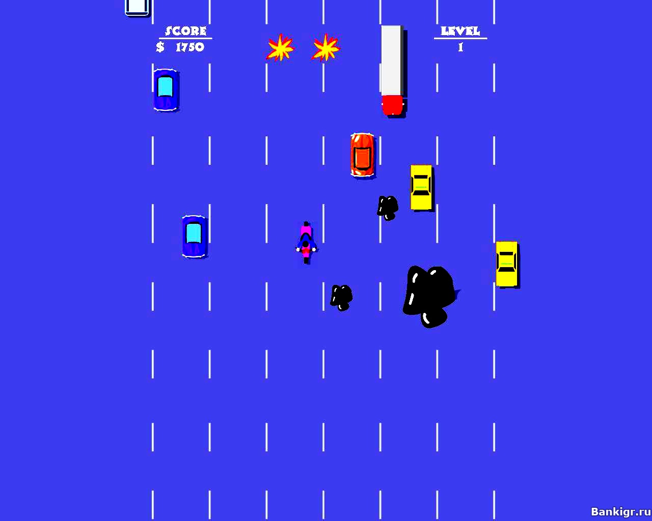 Вы едете на машине по встречной дороге. Ваша задача объезжать машины, лужи масла и собирать деньги. С каждым уровнем скорость машин будет увеличиваться.