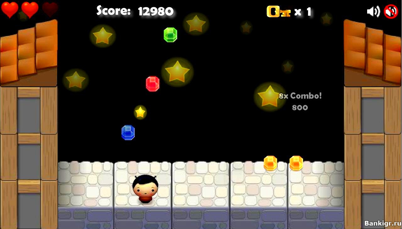 Со всех сторон на вас надвигаются разноцветные кристаллы. Они все очень симпатичные на вид, но не все одинаково полезны :) Избегайте красных, желтых кристаллов, а синие и зеленые собирайте.