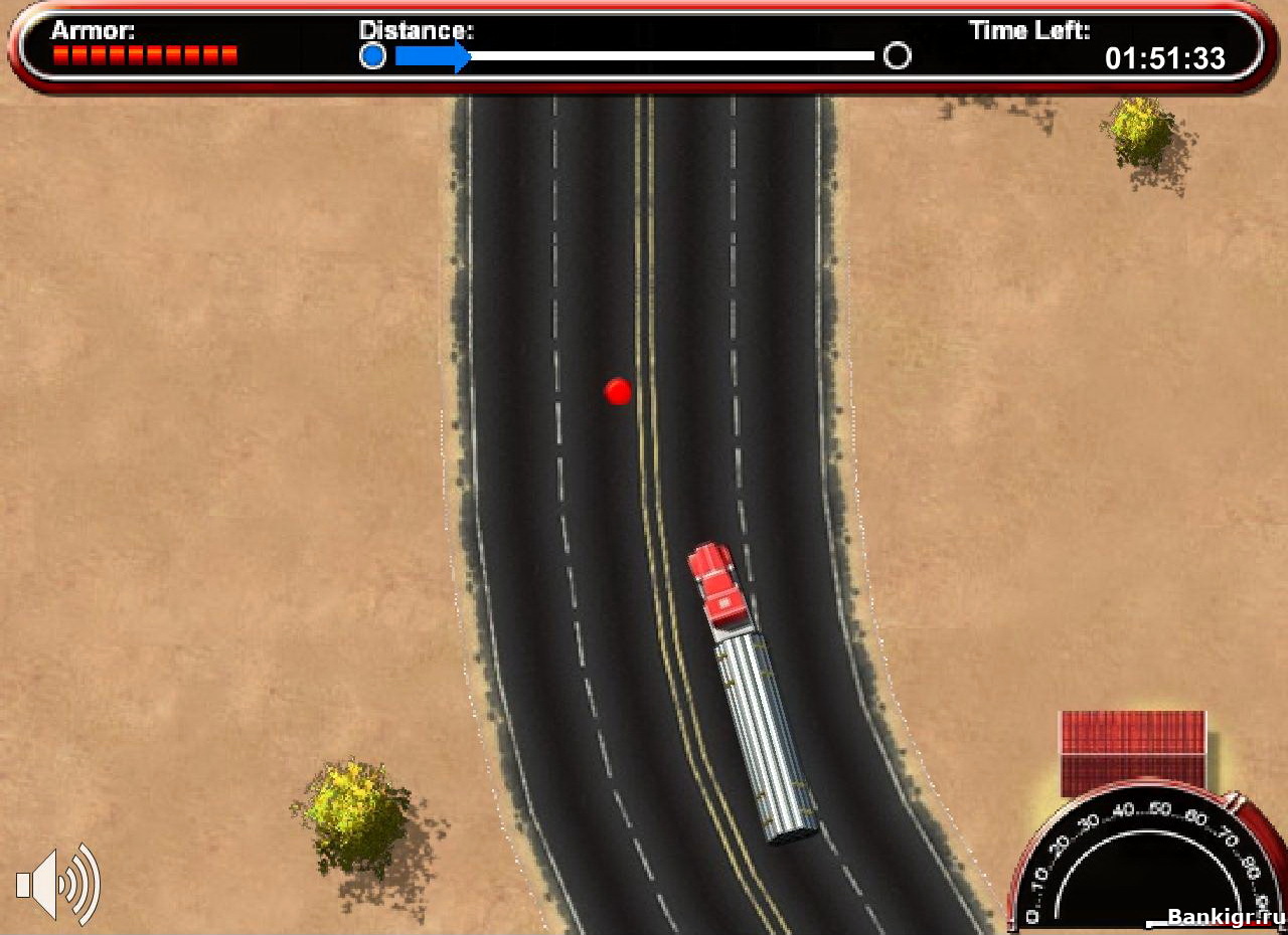 Вы играете за сумасшедшего дальнобойщика. Вам нужно за отведённое время доехать до конца трассы и не сломать свой грузовик. На встречу вам будут попадаться различные препятствия.