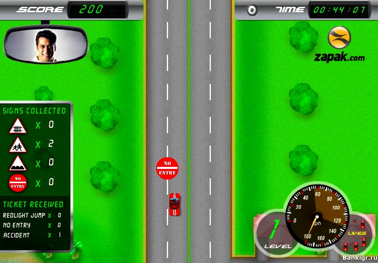 Вы управляете красной машиной, ваша задача собирать различные дорожные знаки и стараться не врезаться во встречные машины и не сбить случайно людей.